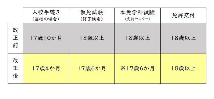 2026年4月1日から道路交通法改正により、普通車・準中型車が17歳6か月で仮免許の取得、本免学科試験の受験が可能となります。