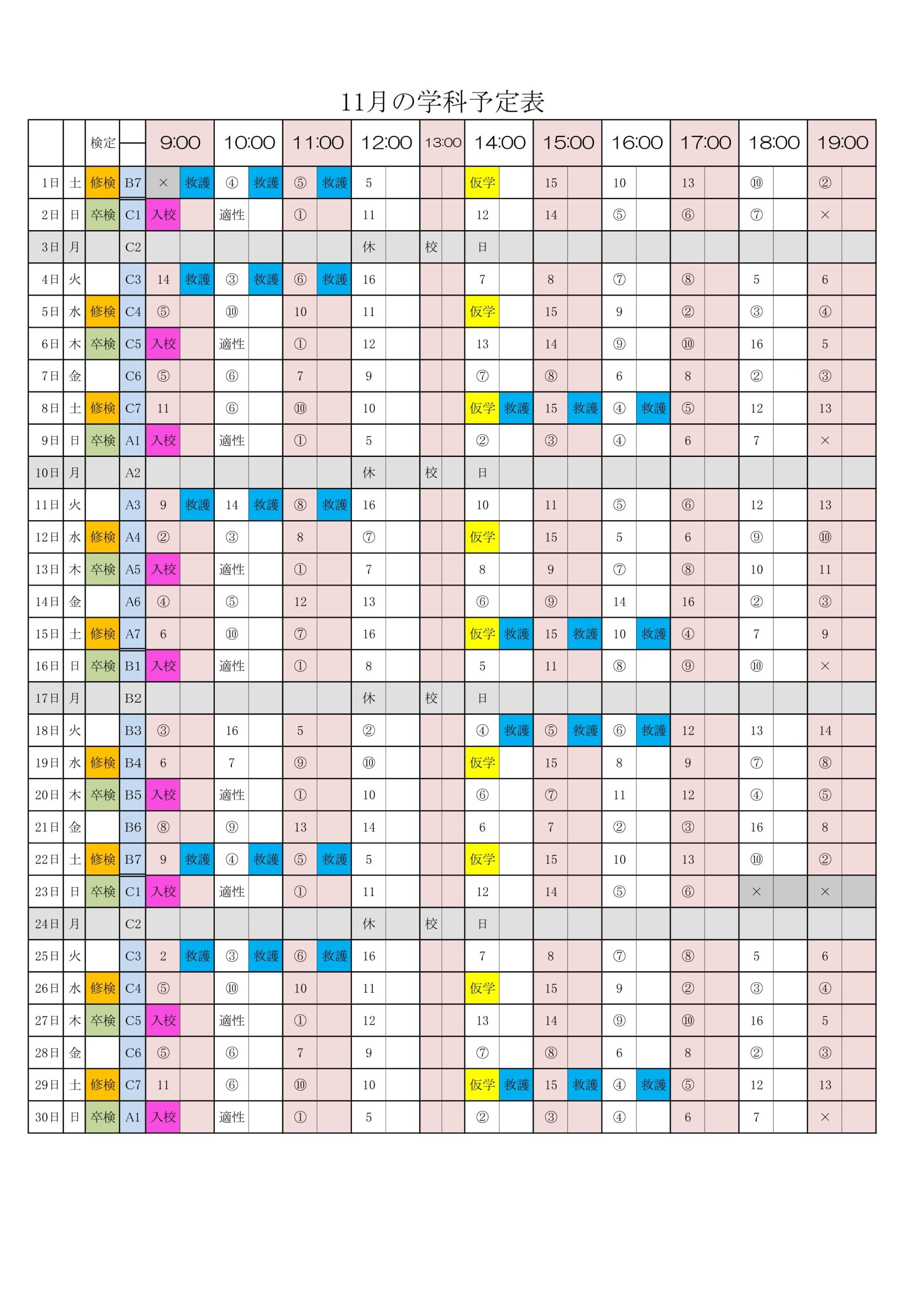 11月1日(土)9時(2H)は職員会議の為、学科はございません。予約済みの「修了検定」「応急救護」は実施してます!