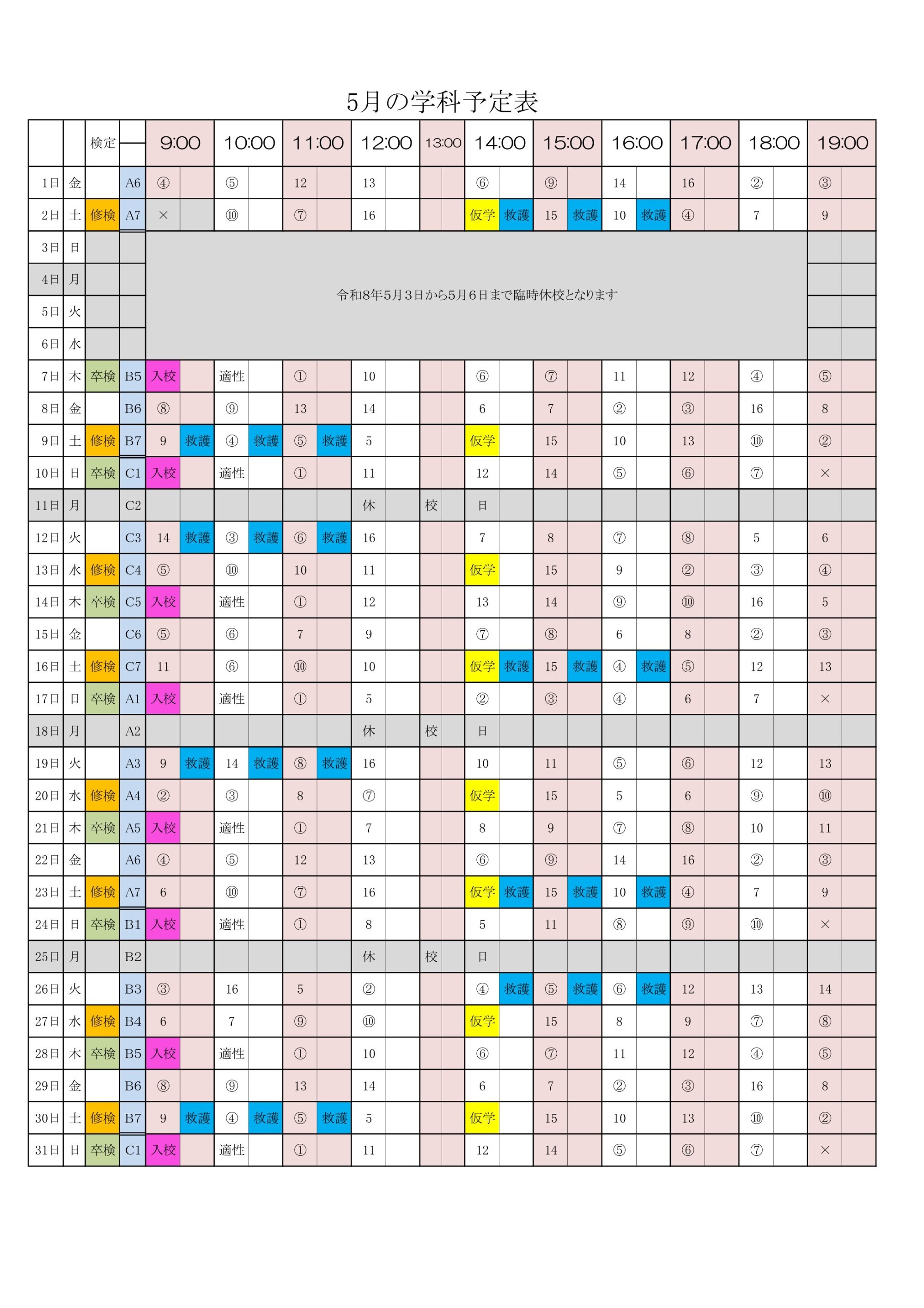 5月2日(土)は会議の為、9時の学科ありません。予約済みの修了検定・応急救護の方は実施します。ご注意ください。(送迎バスも8時台より運行中)
